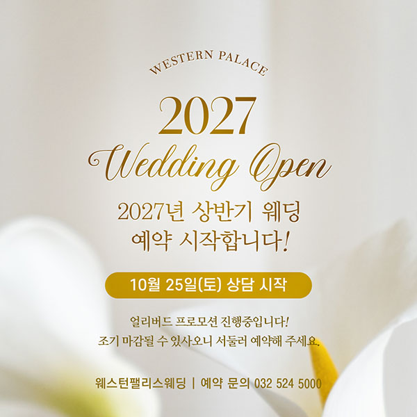 Western Palace,the perfect wedding 럭셔리 그 이상의 가치를 담은지금까지와는 격이 다른 트렌디 웨딩 베뉴, 웨스턴팰리스 Beyond Your Imagine A moment to remember forever 차별화된 컨셉과 최상의 퀄리티로웨딩 문화를 선도하는, 웨스턴팰리스어디에서도 경험할 수 없는 2가지 스타일의 트렌디한 웨딩 베뉴와국내 최정상급 플라워팀과 셰프팀이 인생의 모든 순간들을 빛나게 할단 한 번의 축제를 오롯이 신랑, 신부만을 위해 준비합니다. Our Brand Story →
