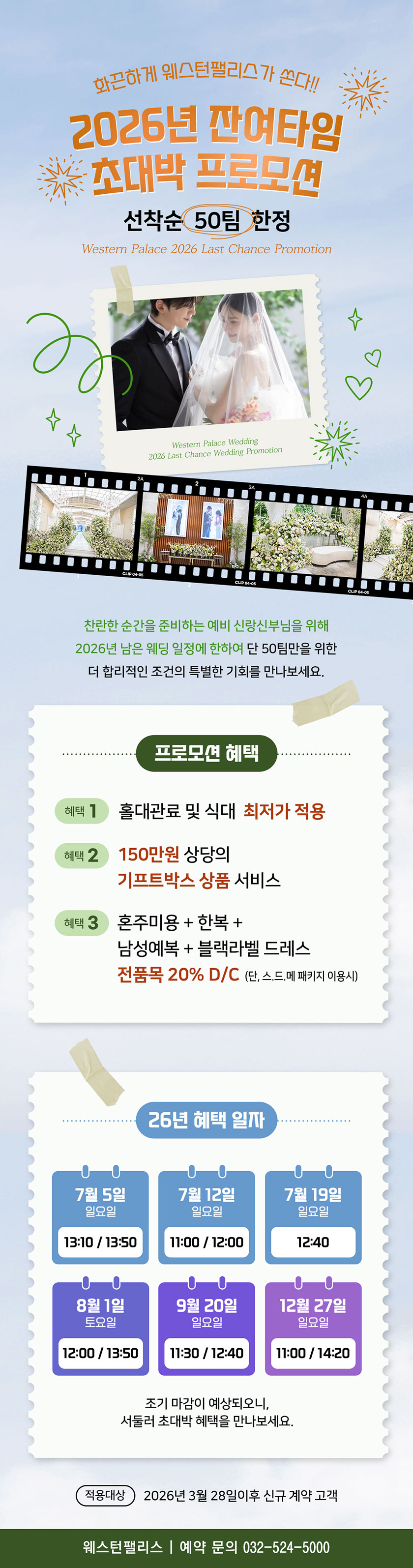 이벤트 상세 혜택 2026년 잔여타임 초대박 프로모션 화끈하게 웨스턴팰리스가 쏜다!! 선착순 50팀, 26년 잔여타임 초대박 프로모션 이벤트 기간 : 2026/03/28 ~ 계속 TEL : 032-524-5000 이벤트 혜택 자세한 사항은 예약실로 문의주세요.대표전화 032-524-5000 이벤트 기간 2026/03/28 ~ 계속 이벤트 조건 ※ 2026.03.28 이후 신규 계약자에 한함 목록 이전 이벤트 이전 이벤트가 없습니다. 다음 이벤트 2027년 프로모션 데이